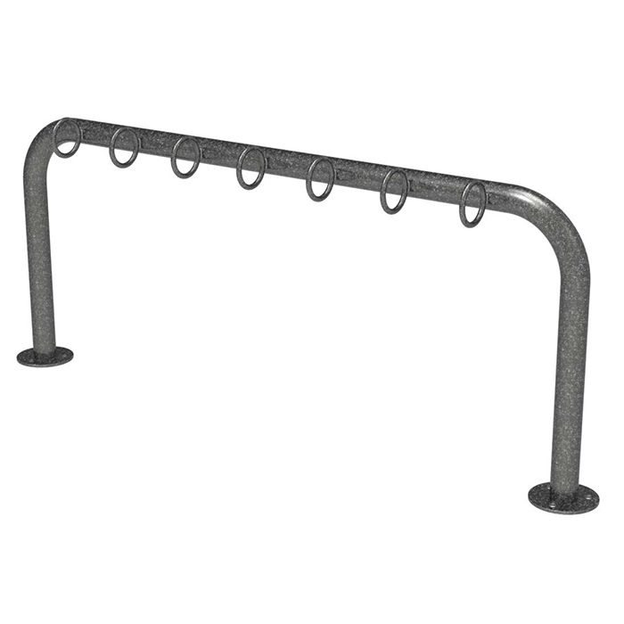 Aparca patinetes en acero para atornillar al suelo con capacidad para 7 patinetes, agarres en acero inoxidable y cuerpo acabado en martele indicado para entornos urbanos, universidades, ayuntamientos o para las entradas a centros comerciales.