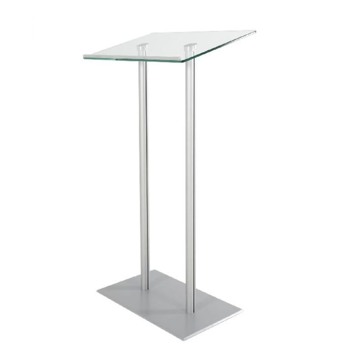 La superficie de este atril para oradores es de vidrio templado de 8 mm con tope para documentos para evitar que se deslicen y mantener organizados los materiales de la presentación y tiene un ángulo de visión de 15 grados para una postura ergonómica. El marco y la base están hechos de aluminio y tiene pies blandos para evitar deslizamientos.