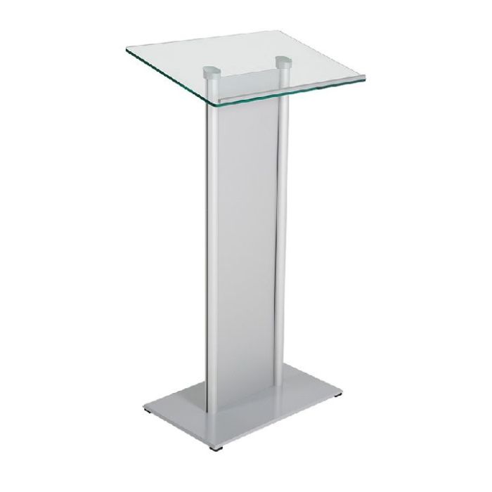 El área de lectura de vidrio templado tiene un ángulo de 15º para facilitar la lectura al orador y tiene un borde de metal para mantener los documentos y materiales en su lugar de forma segura. Una gran placa base de acero proporciona gran estabilidad sin dañar el piso sobre el que se coloca.