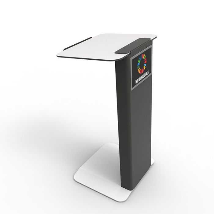 Atril o pupitre para conferencias metálico con el sobre inclinado para mejorar la experiencia de la lectura, columna con tapa extraible para facilitar el cableado del atril sin necesidad de usar herramientas, ruedas y personalizable en la parte frontal.