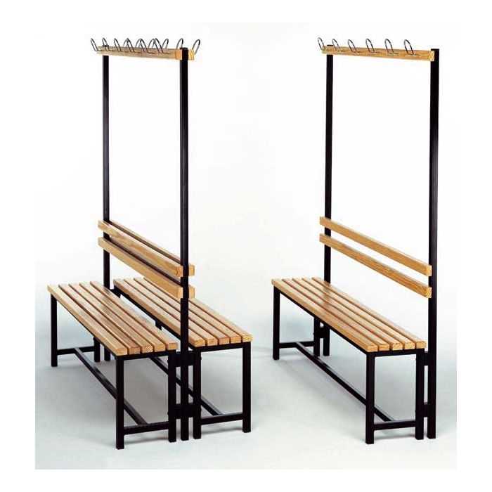 Bancos de vestuario con estructura metálica y asientos en madera barnizada, disponibles en versión sin respaldo, con respaldo o doble cara, todos con perchero superior y colgadores cromados.