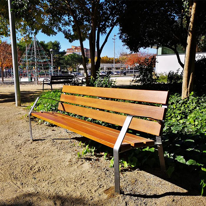 El Banco urbano Carat, fabricado con patas de fundición y listones de madera tropical, es una pieza de mobiliario urbano diseñada para brindar asientos cómodos y estéticamente atractivos en espacios públicos, como parques, plazas, aceras o jardines