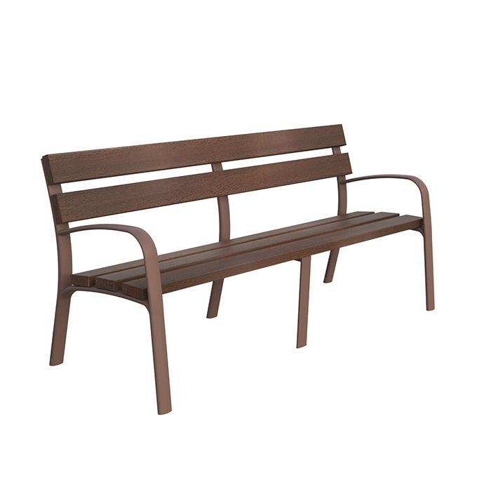 Banco urbano Elix con listones de WPC (compuesto de madera y plástico reciclado) y patas de termoplástico reciclado. Resistente, sostenible y sin mantenimiento.