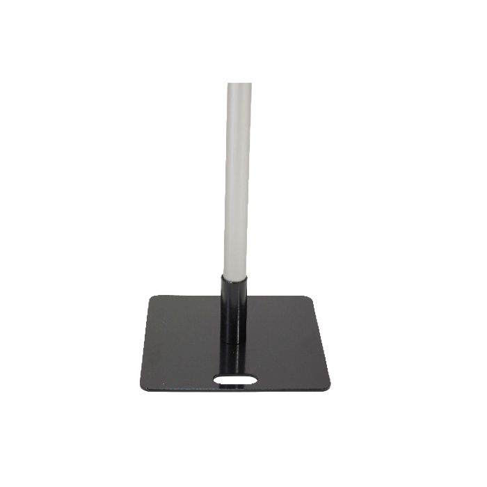 Pletina de acero con pivote central y empuñadura para mástiles telescópicos de diámetro 49 mm. Medidas: 40 x 40 cm. Peso: 10 kg.