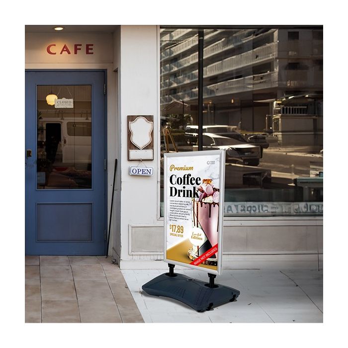 Caballete publicitario exterior doble cara con base rellenable de agua y sistema antiviento mediante muelles. Disponible en formatos A1, B1 y B2, en color gris o negro.