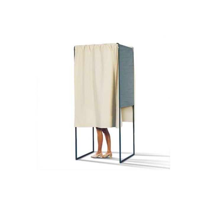 Sujeta por varas altas que impiden la presencia de elementos en el suelo, cada cabina de votación está equipada con dos cortinas opacas de algodón (ignífugas M1) y una estantería elevable. La estantería estará a la derecha o a la izquierda, según la disposición que elija para su colegio electoral. Una vez que el votante ha rellenado el sobre, también puede salir por el otro lado de la cabina de votación.