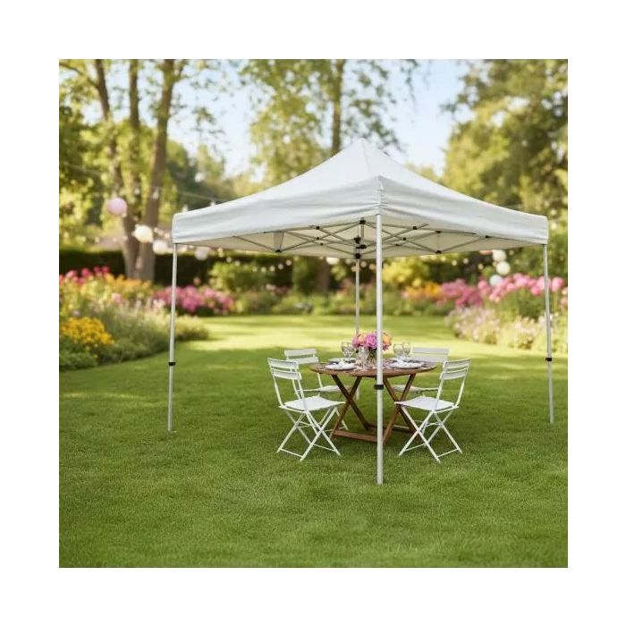 La carpa plegable Alpha 3 x 3 m abierta blanca es una solución profesional, versátil y económica para crear espacios cubiertos en eventos, mercados, ferias o animaciones exteriores.