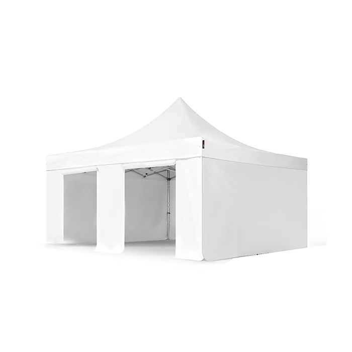Carpa plegable profesional 5×5 m con estructura de aluminio y lonas de PVC 850 g/m², totalmente impermeable e ignífuga. Ideal para eventos, ferias o uso intensivo. Incluye bolsa de transporte, laterales y accesorios de fijación.