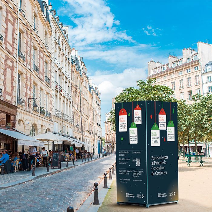Tótem para eventos con cuatro visuales intercambiables y una robusta estructura de acero que se puede desmontar completamente para facilitar el transporte y el almacenamiento. Un tótem para exterior, práctico y robusto, para exponerlo a corto o largo plazo.