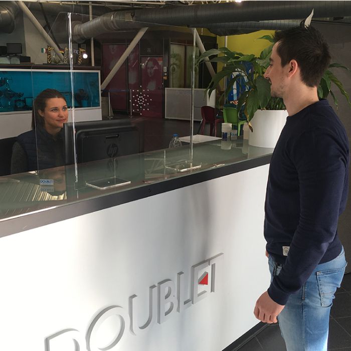 La mampara protectora de vidrio está cortada con láser y doblada en caliente. El cristal de plexiglás tiene 5 mm de grosor. Un círculo de 30 agujeros con un diámetro de 5 mm permite una comunicación fácil y audible. Pasa-documentos, tamaño 30 x 8 cm. Profundidad: 20cm.
