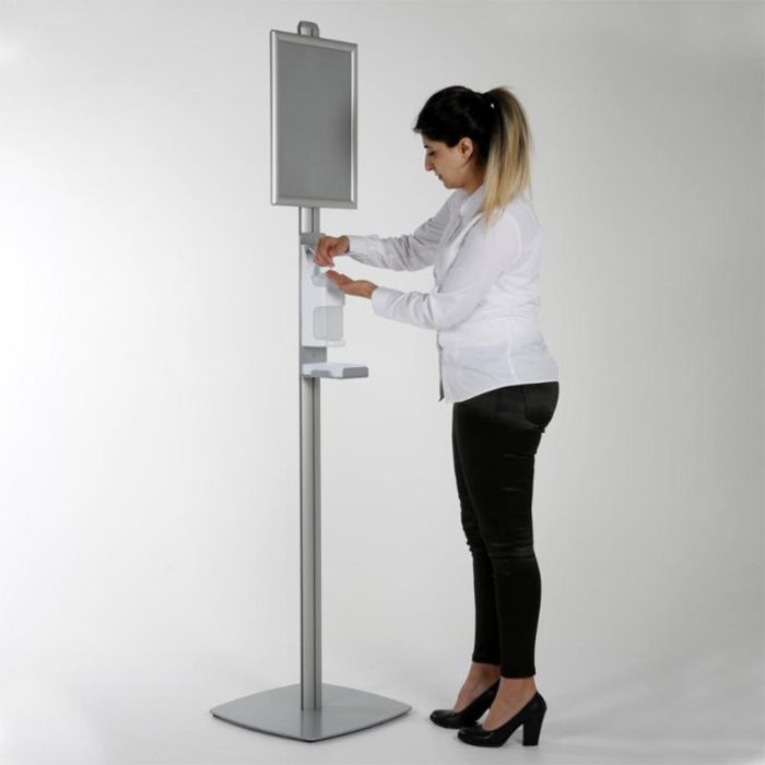 Elemento indispensable para la prevención en transmisiones de virus. Este punto de higiene de 1850 mm de altura, es deal para todos los comercios, farmacias, bancos, hospitales etc. Marco para documentos A4 o A3.