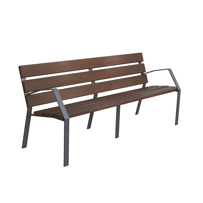 Banco urbano sostenible fabricado con listones de compuesto WPC (50% plástico reciclado y 50% biomasa de cáscara de arroz) y estructura de hierro con acabado martelé. Resistente, ecológico y sin mantenimiento.