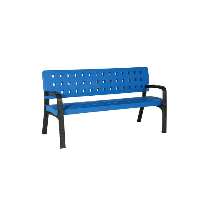Banco urbano Plasticolor fabricado en polietileno de alta densidad (HDPE) con pies reforzados en fibra de vidrio. Antigrafiti, resistente, sin mantenimiento y disponible en diez colores.