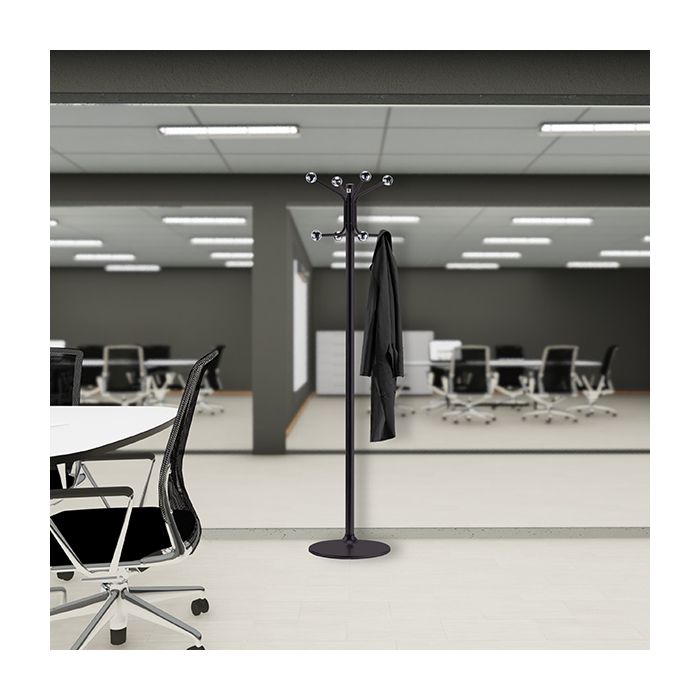 Perchero metálico de 8 colgadores con bolas cromadas. Robusto, estable y con pintura ignífuga, ideal para espacios interiores como oficinas, comercios o zonas de espera.