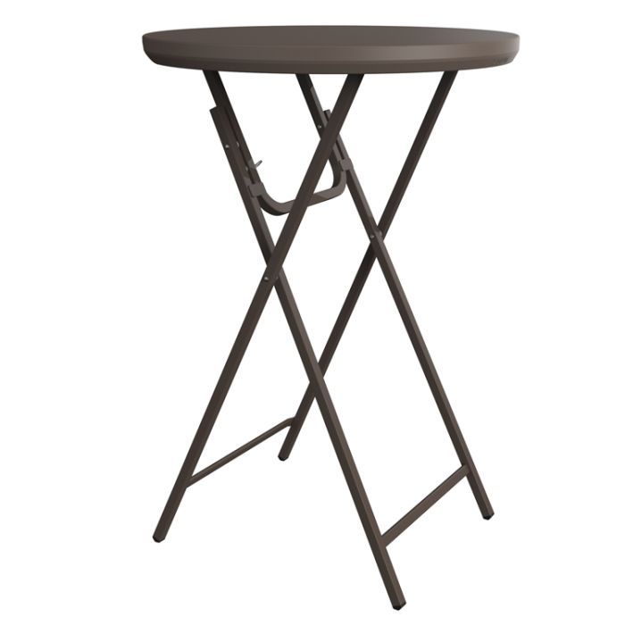 Mesa alta plegable redonda con una apariencia estética muy cuidada, ligera, resistente a los impactos y estable, tiene una estructura de acero pintado por pulverización y sobre en polietileno de alta densidad.