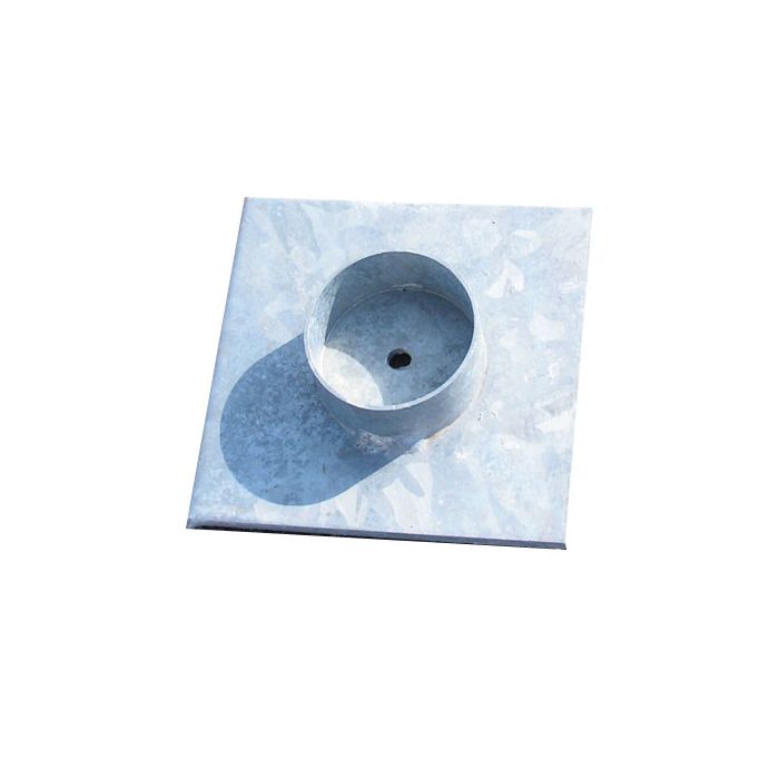 Pletina para pie de rosca. Uso exterior en terrenos blandos, o interior en suelos frágiles y delicados. Pletina en acero galvanizado de 15 x 15 cm. La pletina está provista de una ranura que mantiene el pie de rosca sobre la pletina.