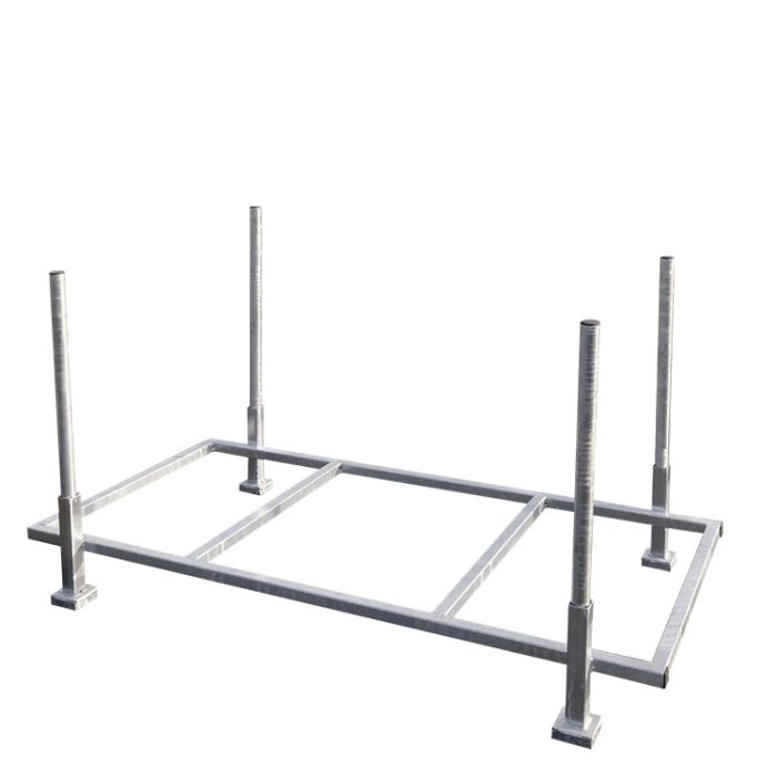 Rack de almacenamiento para los componentes de los escenarios desmontables. Fabricado en acero galvanizado (S235), puede manejarse con una carretilla elevadora. Es capaz de almacenar 17 plantas de escenario o 11 marcos y las barras del podio. Dimensiones totales: 200 x 116 x 100 cm. Dimensiones útiles: 200 x 101 x 80 cm. Peso de la estructura: 33 kg.
