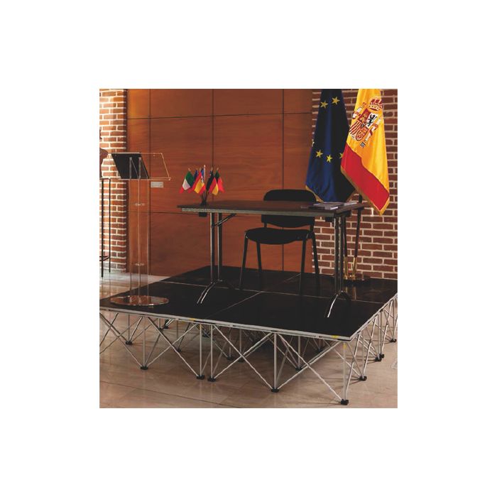 Relación peso / resistencia excepcional, con una resistencia a la carga de 750 kg/m². Plataformas en madera contrachapada de 18 mm con la superficie del suelo pintada y antideslizante (con refuerzos interiores), estructura de aluminio de 12 mm de diámetro. Medidas del escenario abierto (l x a x A) = 100 x 100 x (20-40-60) cm. Peso de la estructura = 3 kg. Peso de la plataforma = 12 kg.