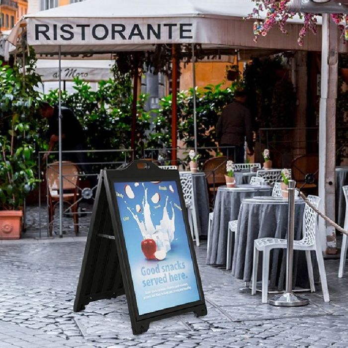 Fabricado en plástico de alta calidad y duradero, el caballete publicitario plegable con ruedas porta un marco exterior de doble cara para mayor visibilidad y un plástico protector antireflejos.