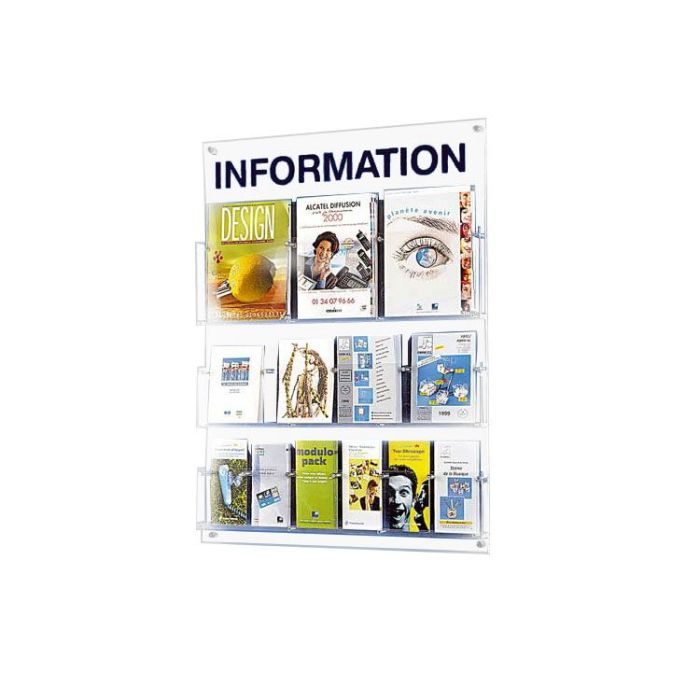 Este elegante expositor mural en metacrilato, puede albergar varios formatos de documentación totalmente visibles y se adapta a cualquier decoración.