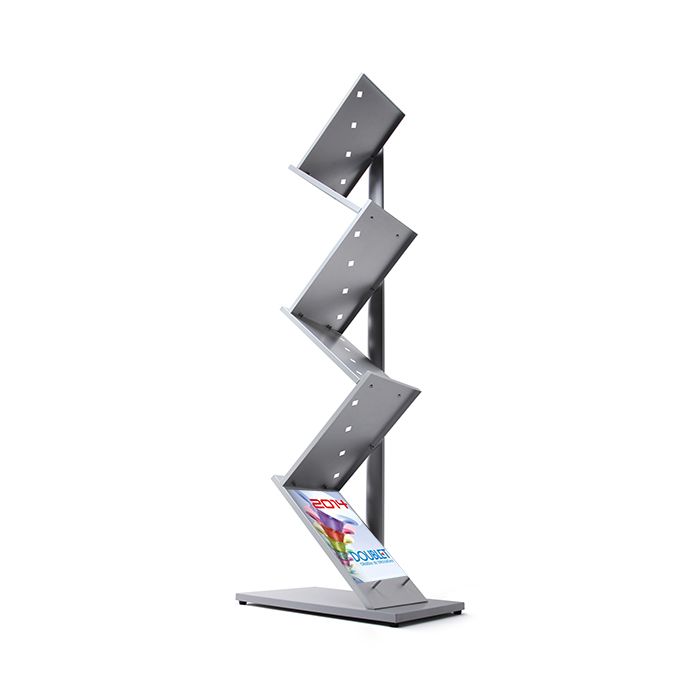 Portafolletos de pie en alumunio muy versatil, tiene un atractivo diseño de dos caras con alta capacidad para exponer catálogos. Contiene 6 estanterías con revestimiento en polvo en color plata para exponer material publicitario de formato A4 vertical. Fácil montaje.