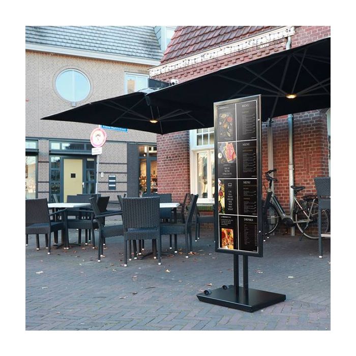 El portamenús para exterior negro Liora es la solución ideal para establecimientos de hostelería y comercios que desean una presentación elegante y segura de sus menús o promociones en exterior. Su estructura en color negro, de líneas finas y modernas, combina estética y funcionalidad para resaltar cualquier comunicación con un estilo profesional.