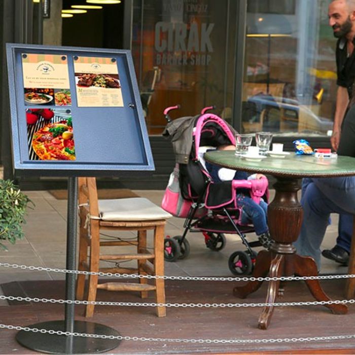 Este portamenús para restaurantes es una solución perfecta tanto para uso en exteriores como interiores, ideal para realzar la imagen de su restaurante o cafetería. Su diseño versátil lo convierte en una herramienta indispensable para mostrar menús, ofertas, etc., con la facilidad de cambiar el mensaje según sea necesario.