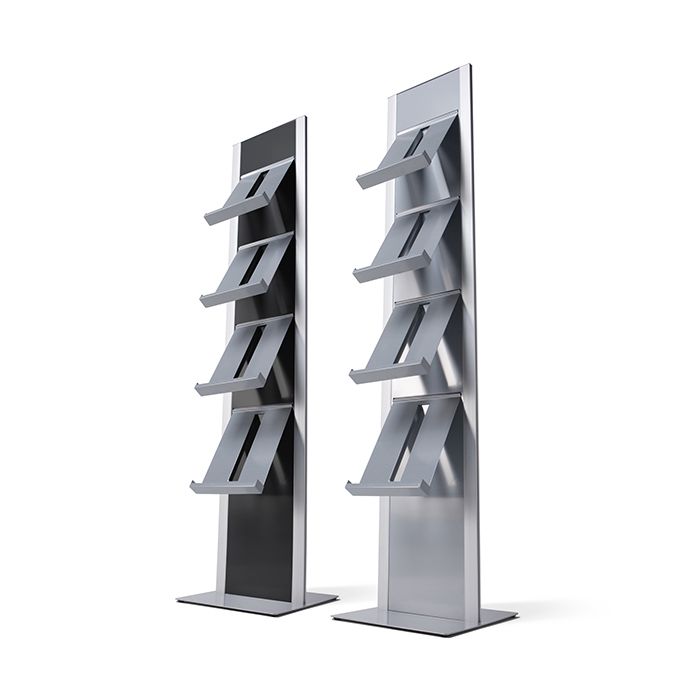 Este portafolletos de pie tiene perfiles con borde de aluminio plateado con un panel central con recubrimiento de pintura en gris o negro y base gris. Es muy fácil montar ya que los 4 estantes metálicos o compartimentos transparentes se colocan fácilmente en las ranuras para mostrar folletos.