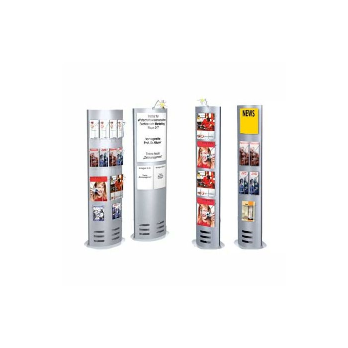 Los compartimentos para folletos se insertan en la superficie metálica, en la que se perforan agujeros casi invisibles. Los bolsillos de plástico para carteles con aspecto de cristal se adhieren mediante bandas magnéticas. Los documentos y carteles se pueden cambiar en segundos.