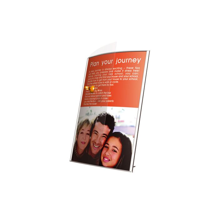 Marco curvo y base en aluminio anodizado. Lámina transparente protectora.