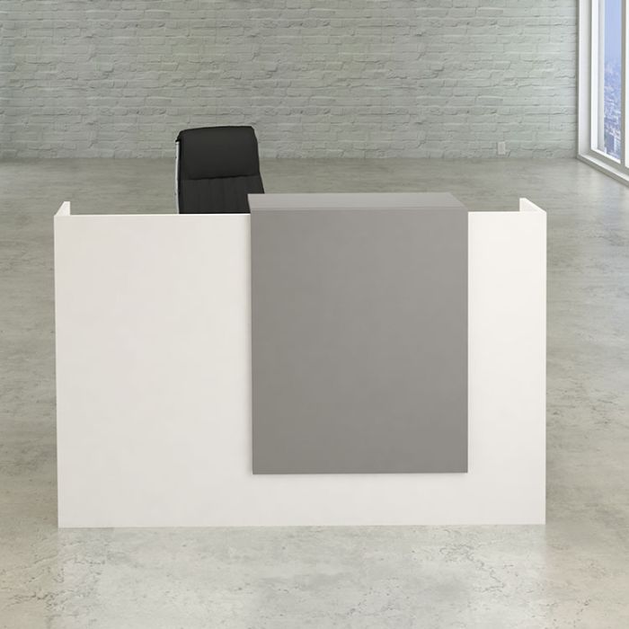 El mostrador es de color blanco, con frontal de grafito. La altura total del mostrador es de 110 cm, el área de trabajo tiene 75 cm de alto y 80 cm de profundidad. Hay 2 salidas de cable en la parte superior de la mesa.