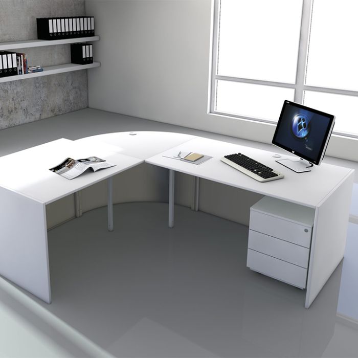 Este mostrador de recepción modular ofrece la solución ideal en lo que respecta a la comunicación directa con fabricación en madera y acero y paneles de melamina recubierto con bordes ABS. Hay tres salidas de cable integradas en los escritorios. El tablero de escritorio está disponible en blanco. El frente está disponible en plata y está decorado con tiras blancas.