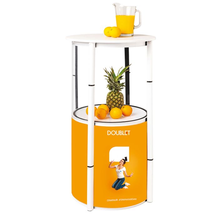 Un mostrador plegable y modulable enteramente personalizable. Estructura plegable de aluminio y plástico. Montaje sin herramientas. Viene con un estante intermedio. Bolsa de transporte para los visuales incluida.