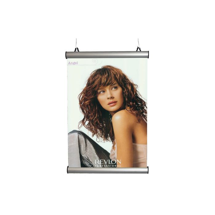 El el perfil de sujeción que se fija suspendido o a la pared, está fabricado en aluminio anodizado y está adaptado para papel, tejido y lona de gran formato para carteles de hasta 1 mm de grosor.