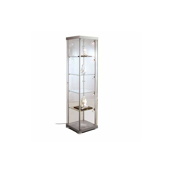 Las atractivas y estables vitrinas Elegant con base cuadrada, rectangular y redonda están equipadas con 4 estantes de cristal de 5 mm de espesor, son ajustables en altura que garantizan una gran estabilidad e incluyen cerradura.