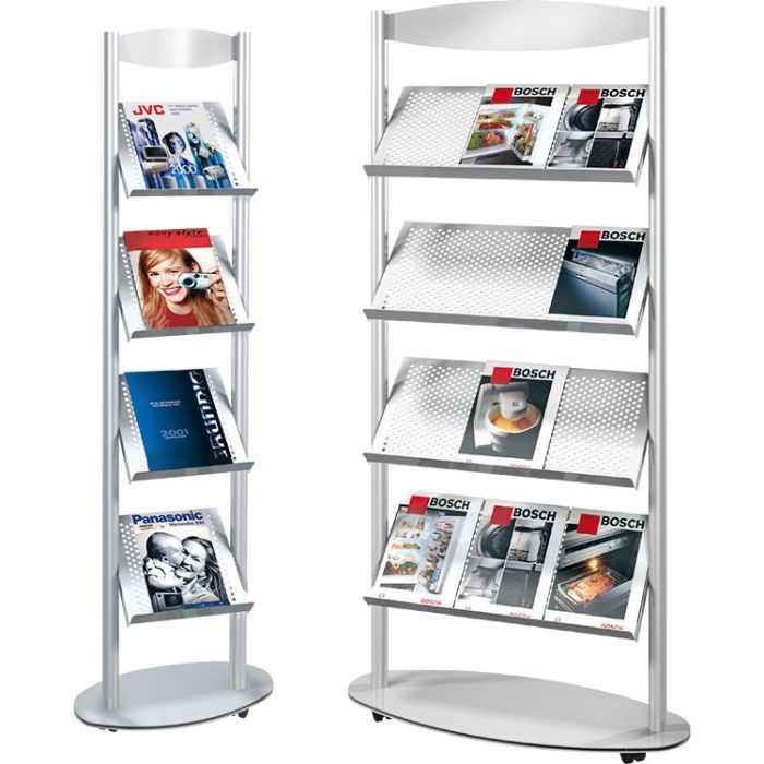 Los estantes para folletos son de acero con recubrimiento de polvo. Dos columnas de tubo redondo estables están conectadas con 4 estantes inclinados hechos de acero perforado de alta calidad y un borde de tope de 40 mm de alto para 3 formatos A4 cada uno. El panel superior puede personalizarse con su logo (concultar). Estable sobre una gran placa de base ovalada con 4 ruedas giratorias todas con frenos.