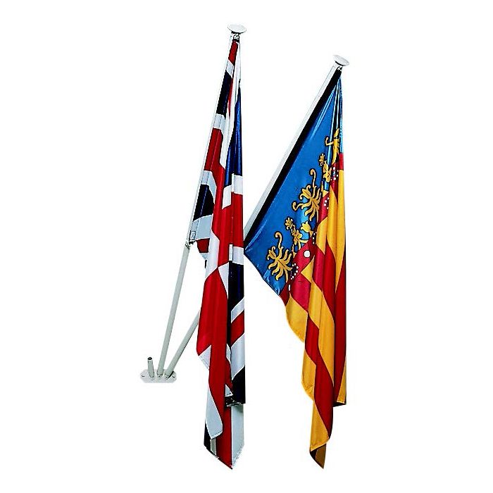 Acompañando al mástil, ofrecemos un soporte mural en acero, también lacado en blanco (RAL 9003), que se puede configurar para sostener uno, dos o tres mástiles de aluminio. Este soporte, con una inclinación de 45°, no solo asegura una visibilidad óptima de las banderas sino que también añade un toque de distinción y profesionalidad a cualquier fachada.