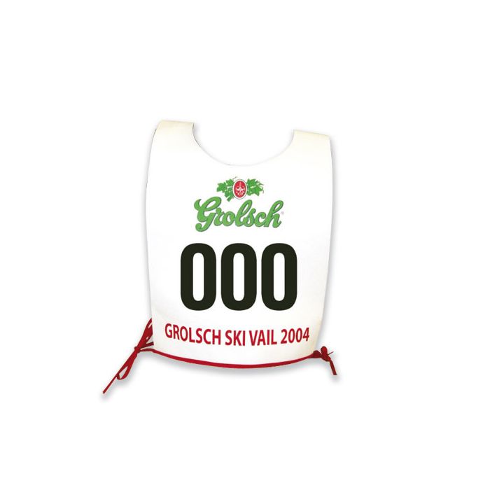 - Dorsal adulto de 30.5 x 46 cm con bordes cortados en el cuello y la cara. Se fijan con nudos a los lados. Se venden en lotes de 10 unidades (precio unitario).