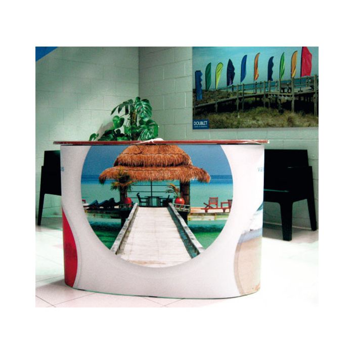 Práctico mostrador plegable para toda clase de eventos o exposiciones de uso interior con personalización incluida en papel fotográfico encapsulado que incluye una práctica estantería.