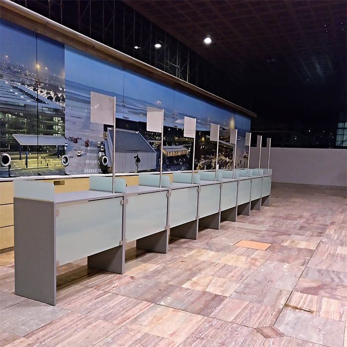 Aplicaciones: Este mostrador no solo es ideal para la atención eficiente y profesional de los clientes por parte de touroperadores, sino que también mejora la estética del espacio del aeropuerto, ofreciendo una zona de trabajo claramente definida y visualmente atractiva.