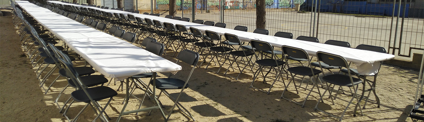 Por otro lado, si tienes un espacio amplio, contamos con mesas plegables XXL, diseñadas para acomodar a un mayor número de invitados. Estas mesas pueden unirse entre sí, permitiendo crear superficies más grandes y ofreciendo aún más capacidad. Se trata de una solución perfecta para grandes celebraciones organizadas por entidades y colectivos.