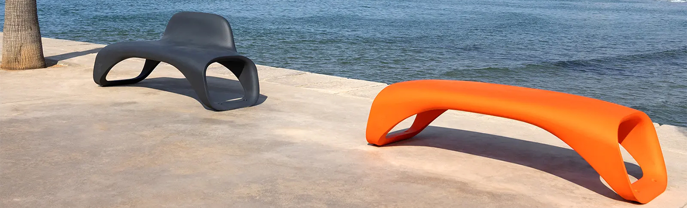 Bancos Tao y Naura → De polietileno reciclado, resistentes, sin mantenimiento y disponibles en una amplia gama de colores para adaptarse a todo tipo de entornos.