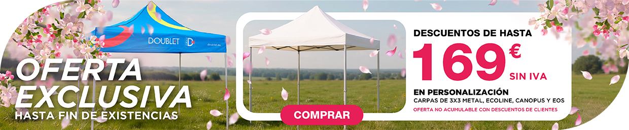 Actualmente puede beneficiarse de hasta 169 € de descuento en la personalización de carpas plegables 3x3 en los modelos Metal, Ecoline, Caopus y EOS.