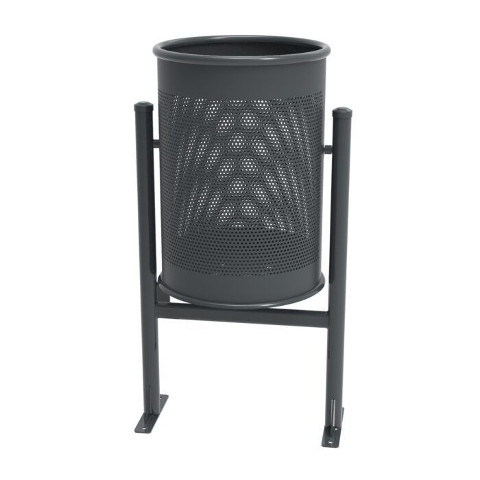 Papelera urbana circular abatible, fabricada en chapa perforada con una capacidad de 60 litros ideal para la vía pública y entornos urbanos.