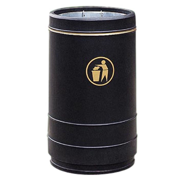 La papelera gran capacidad de 90 litros Libra, tiene la parte superior abierta de diseño elegante y tradicional que está disponible en seis colores estándar, cada uno con una banda dorada decorativa alrededor de la circunferencia de la papelera.