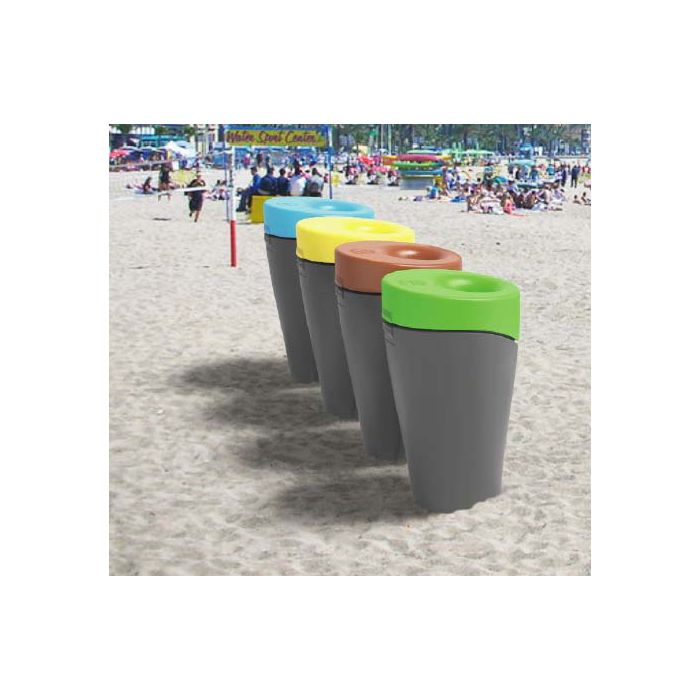 Papelera para playas Florencia de 120 litros, fabricada en polietileno resistente con cuerpo gris y tapas en 4 colores para recogida selectiva. Personalizable y apilable.