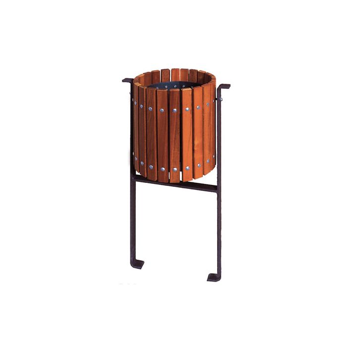 Elegante papelera de exterior con soportes y estructura de pelatina metálica y recubierta de listones de madera de guinea que es perfecta para espacios exteriores como jardines, parques, muelles, etc.