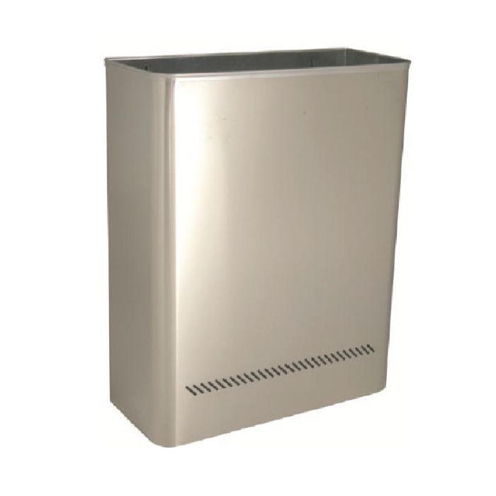 Papelera mural de interior perforada en acero inoxidable satinado, con dos taladros en la parte trasera para su colocación a pared, ganchos interiores para bolsa y aro rectangular, basculante, realizado en varilla de acero y pintado en gris plata.