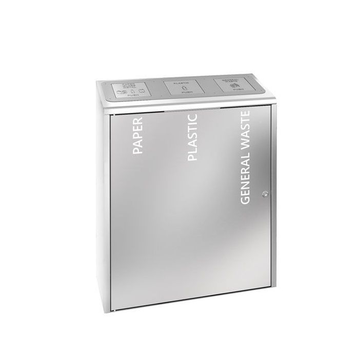 Elegantes papeleras para la recogida selectiva con estructura de acero inoxidable satinado, con tres puertas de empuje de acero inoxidable con letreros de tipos de residuos y puertas con cerradura de llave triangular.
