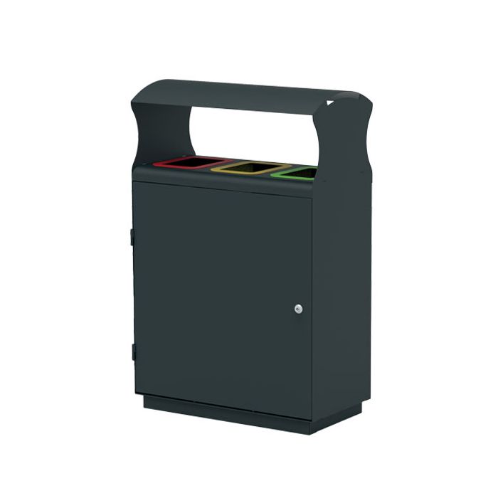 Esta papelera de reciclaje cuenta con tres aberturas estratégicamente ubicadas, lo que facilita la separación y el reciclaje eficiente de diferentes tipos de residuos. Además, los marcos de colores para la recogida selectiva permiten una identificación clara y rápida de los contenedores correspondientes, fomentando así una práctica de reciclaje organizada y efectiva.